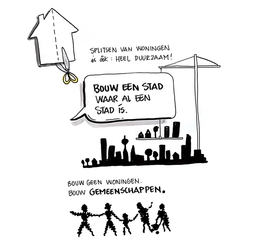 Het toevoegen van woningen in de bestaande stad is volgens Alkemade niet alleen een technische rekensom, maar vooral een ontwerp- en cultuurvraag. Daarom pleit hij voor een fundamentele koerswijziging: bouw een stad waar al een stad staat. “Als je in bestaande wijken gemiddeld 12,5 procent woningen toevoegt, bijvoorbeeld via woningsplitsing, optoppen of herbestemmen, dan heb je een miljoen extra woningen, zonder nieuwe grond in te nemen.”
